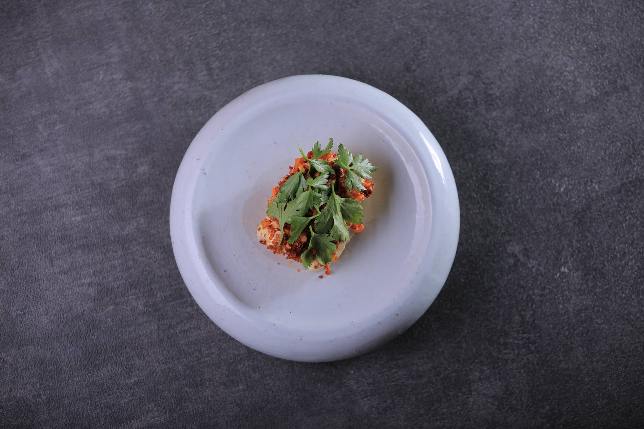 تغرف صلصة الطرطور بالحمضيات لتغطي سطح السمكة، ثم يوضع 1-2 ملعقة كبيرة مع فتات المحمرة والأعشاب الطازجة.