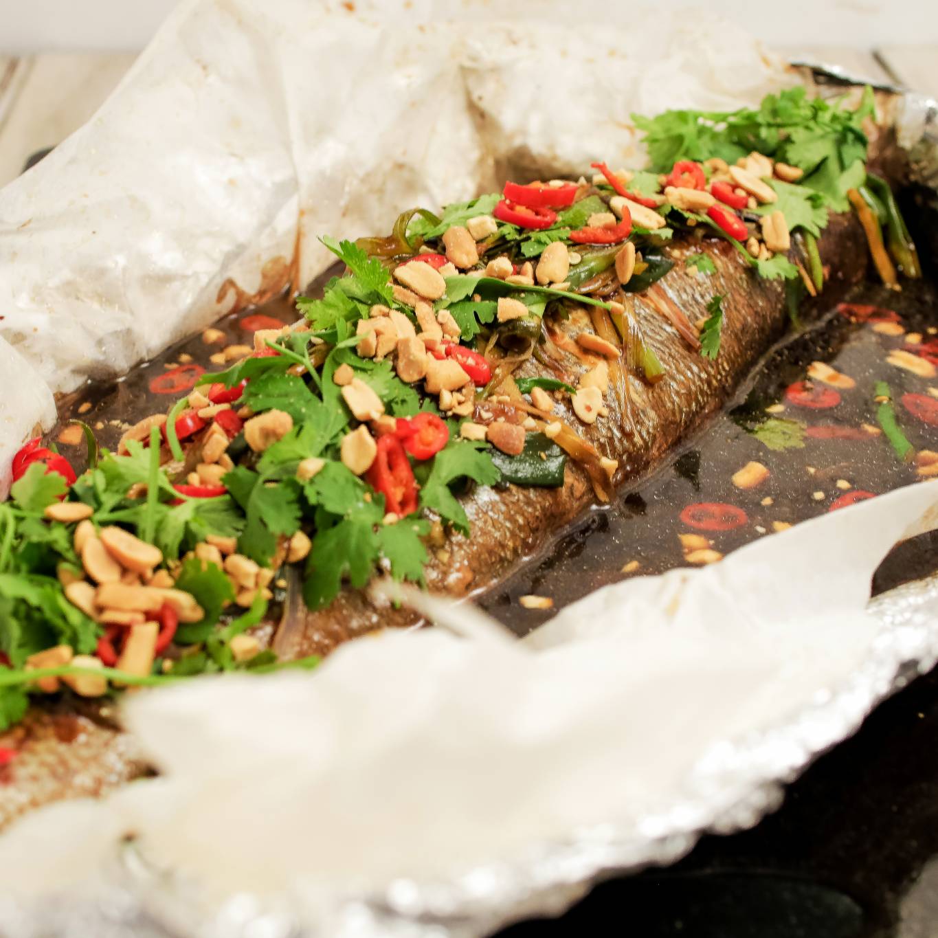 نخرج السمكة من الفرن و نفتح الفويل و نضيف صوص البصل الأخضر و الجنزبيل علي سطح السمكة و نرش الفو ل السوداني المحمص و نزين بأوراق الكزبرة و شرائح الفلا الأحمر الحار