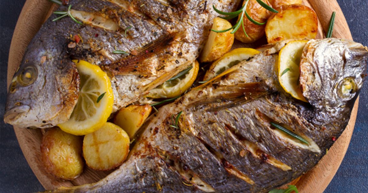 1- بواسطة سكين، إصنعي شقوقاً في سمكتي الدنيس. 2- في وعاء، ضعي الملح، الكمون، الكاري، البابريكا، الفلفل الأسود، عصير الليمون والزيت. أخلطي المكونات حتى تتداخل. 3- إدهني جونب وداخل سمك الدنيس بالتتبيلة. 4- في صينية الفرن، ضعي البطاطس، البصل والثوم. زيدي الليمون الحامض ثمّ ضعي السمك مع التتبيلة على الوجه. 5- أدخلي الصينية إلى فرن محمّى مسبقاً على حرارة 180 درجة لـ40-45 دقيقة حتى ينضج السمك والخضار. 6- أخرجي الصينية من الفرن وقدّميها على سفرتك. ألف صحة!