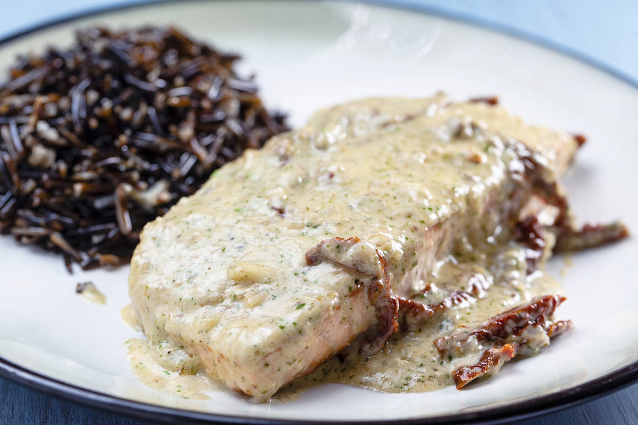 عندما تبدأ الصلصة بالغليان، يضاف السلمون ويطهى لبضعة دقائق.