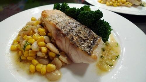- نحضر طبق التقديم ونضع السمك فيه والفلفل الألوان ثم نضيف صوص الشبت ويقدم .