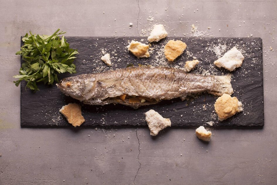 نضرب بياض البيض مع الملح لحد ما بيقى فوم ونغطى بها السمكة