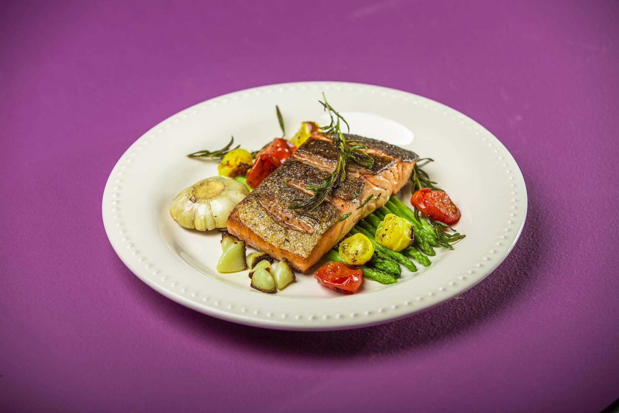 تسخن مقلاة على حرارة متوسطة ويضاف زيت الزيتون عندما تصبح المقلاة ساخنة. حين يبدأ الزيت بالتدخين قليلاً يضاف السلمون وجانب الجلد للأسفل. ضع أصابعك على وجه فيليه السمك لتبقى مسطحة وجميلة. يتبل الوجه بالملح ولا يلمس بعد الآن. يراقب السلمون ويقلب إن تلون ثلثي الفيليه بمقدار ثلثي استواء. تضاف الأعشاب ويقسم الثوم إلى نصفين ويترك يطبخ مع السلمون.