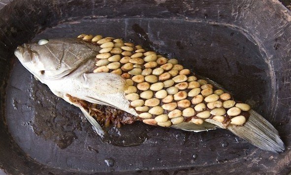 - احشي شق السمك بنصف كمية معجون التمر، ثم أضيفي شرائح البصل الدائرية، وافركي السمكة من الخارج بما تبقى من التمر وبالثوم وتزين من الخارج باللوز المحمص.
