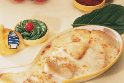 - تُسكب صلصة البشاميل فوق السمك ثم يُرشّ الوجه بجبنة الموتزاريلا المبشورة.