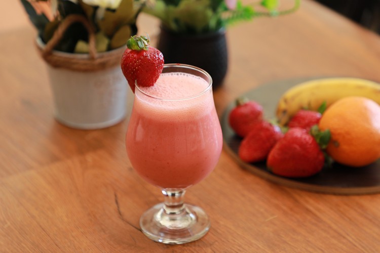 - ضعي اللبن والموز والفراولة وعصير البرتقال والعسل بالخلاط الكهربائي.