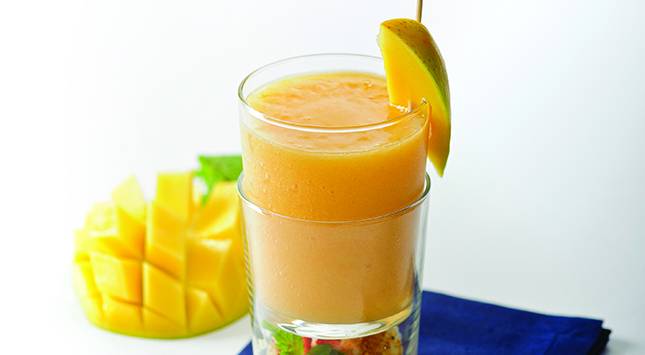تُقطع قطع المانجو والموزة لتسهيل ضربها في الخلاط، ثم تُضرب جميع المكونات في الخلاط أو ماكينة السموذي لمدة 30 ثانية تقريبًا.