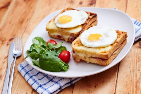 - نخرج السندويش ونضعها في طبق تقديم ونضع فوقها مباشرة شريحة جبن بارميزان وفوق الشريحة نضع البيض الناضج. أصبح سندويش كروك مدام جاهزاً.