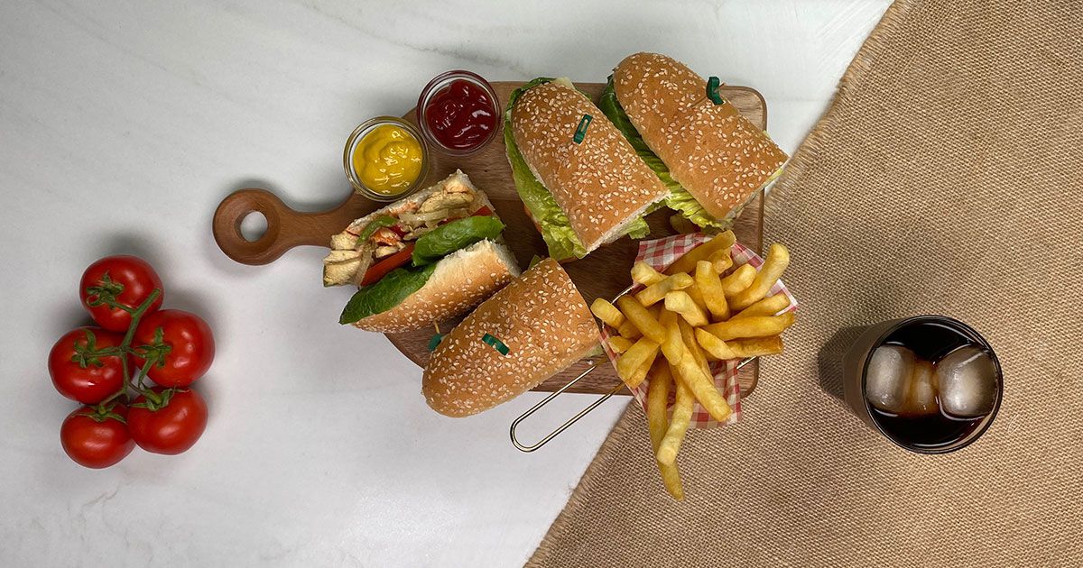 6- ضعي الجزء العلوي للخبز، قطعي السندويش الى قسمين متساويين وقدمي الطبق على سفرتك.