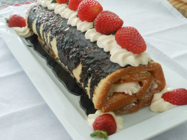 9. نفرد السوسرول ونحشية بالحشوة المرغوبة مثل الكريما أو الكاسترد ونزينها بصوص الشوكولاتة و الفراولة