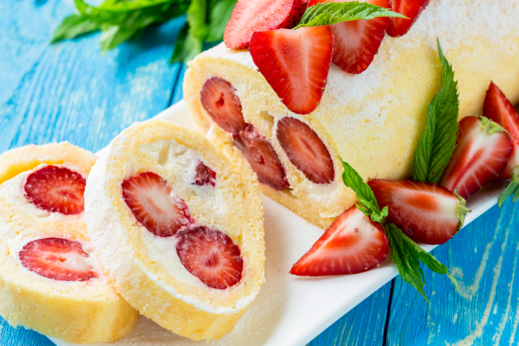 - ابسطي الكيك على سطح العمل وادهني كريمة الخفق على الوجه، أضيفي مكعبات الفراولة وأعيدي تشكيل الكيك على شكل رول.
