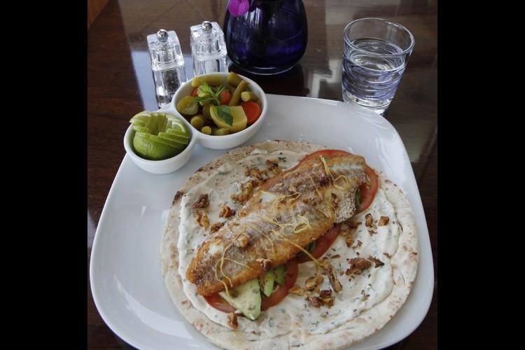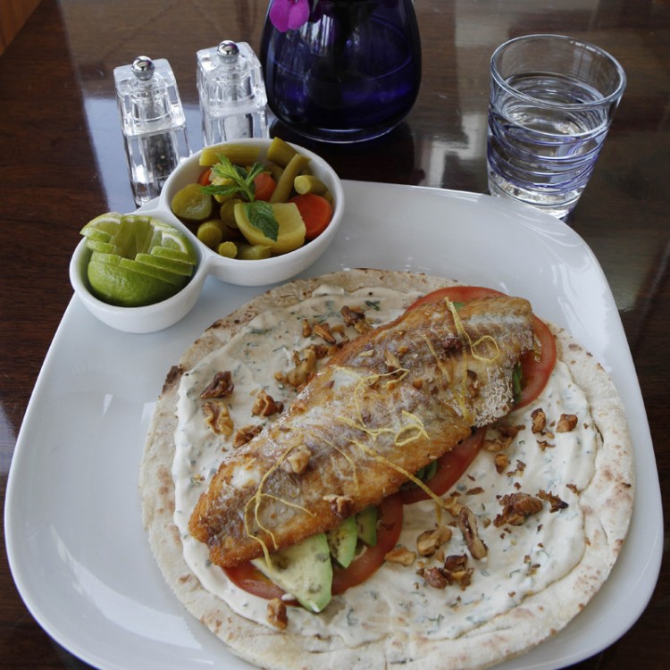 5- في طبق التقديم، توضع أرغفة الخبز العربي، وتسكب الطحينة والجوز المفروم والتوابل فوقها.ثم،تضاف شرائح السمك وحبّات البندورة وقطع الأفوكادو.