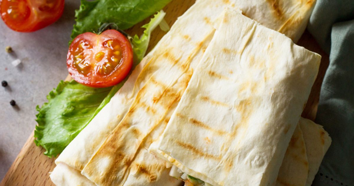 4- إفردي خبز الصاج على سطح العمل وادهنيه بالمايونيز. أضيفي خليط الشاورما ولفّي الخبز على شكل ساندوتش.