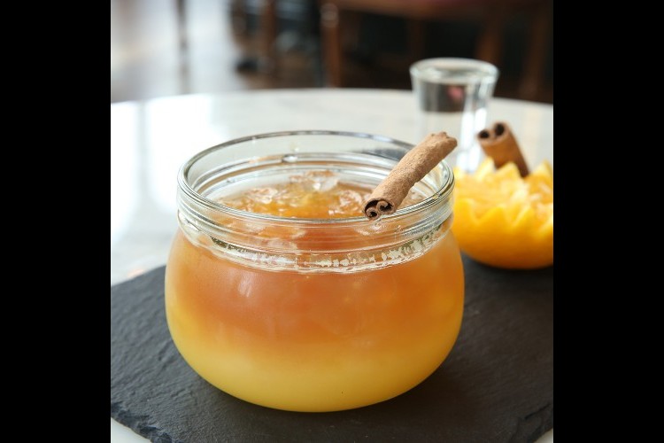 3. يُزيّن الشراب بشريحة من البـرتقال وعود من القرفة، ويُرشّ مسحوق القرفة عند تقديم فنجان الشاي. ويُقدّم مع الشيرة (القطر).