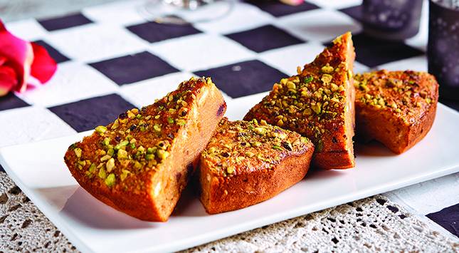 يوضع جانبًا كي يبرد، ثم يقطع إلى شرائح ويقدم.