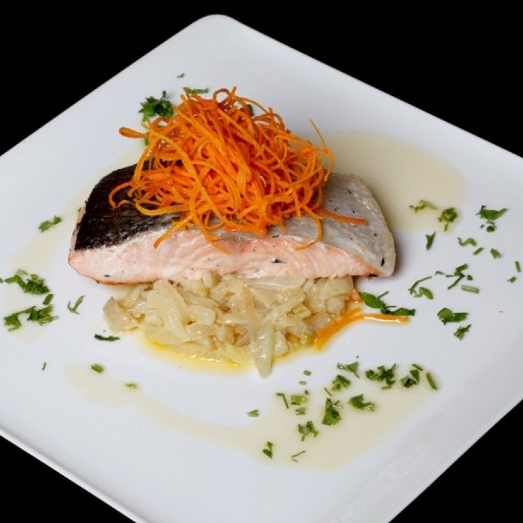 تترك لخمس دقائق على جنب، وتضاف شرائح سمك السلمون وتوضع في الفرن على 180 درجة