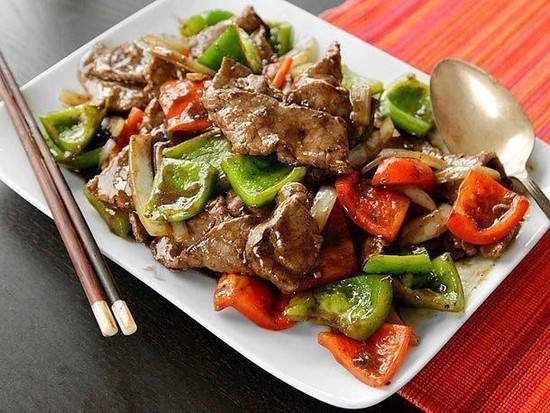 - يغسل اللحم ويصفي ويقطع إلى شرائح ويوضع في صينية .