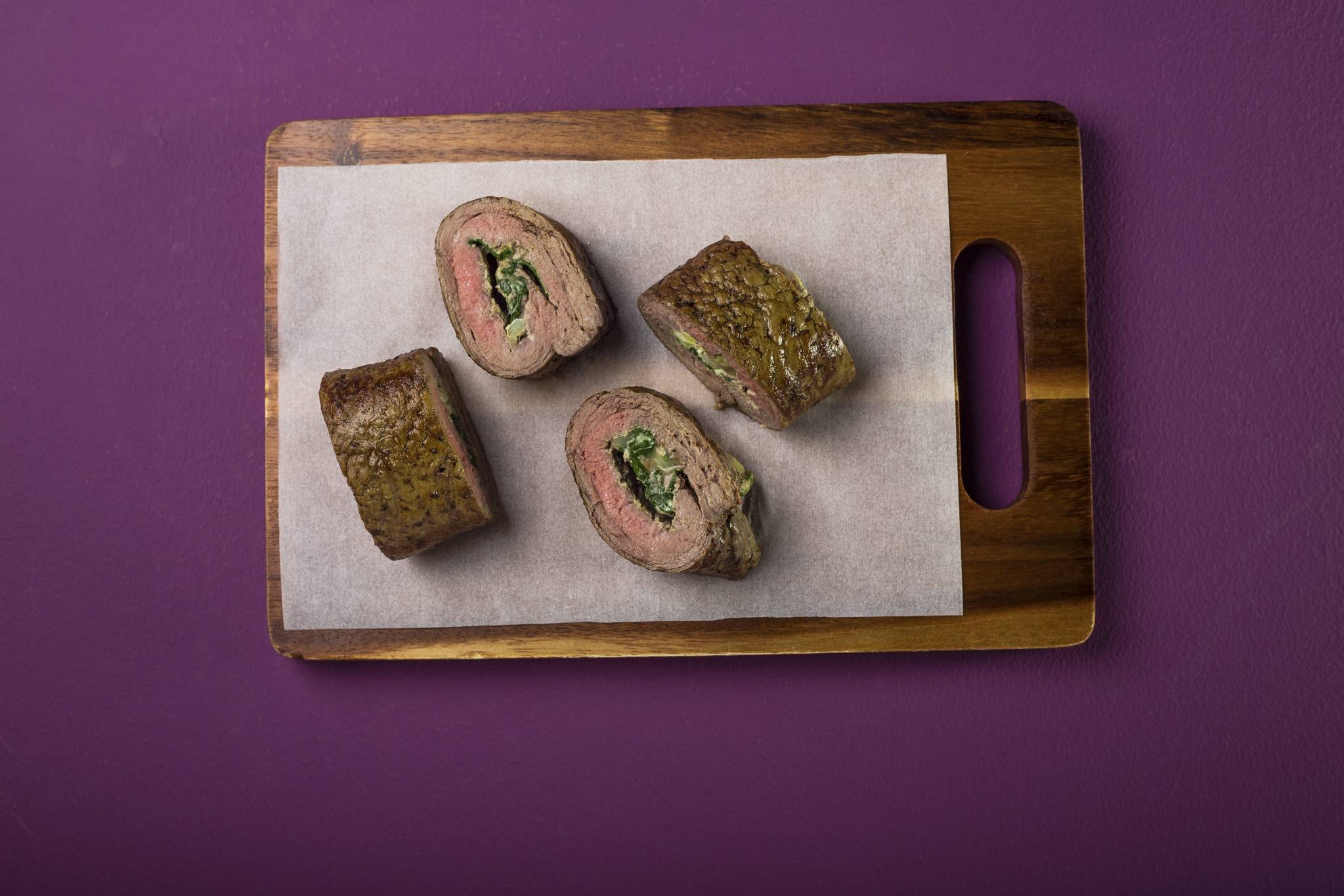 يمد مزيج جبنة الكريم على شريحة اللحم، ثم توضع شرائح جبنة البوفولون وأوراق السبانخ