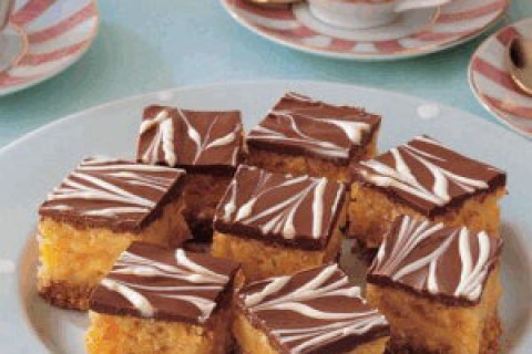 - تُسكب الشوكولاتة المذوّبة المرّة والبيضاء على سطح القالب وتُترك لتستقرّ قبل التقطيع.