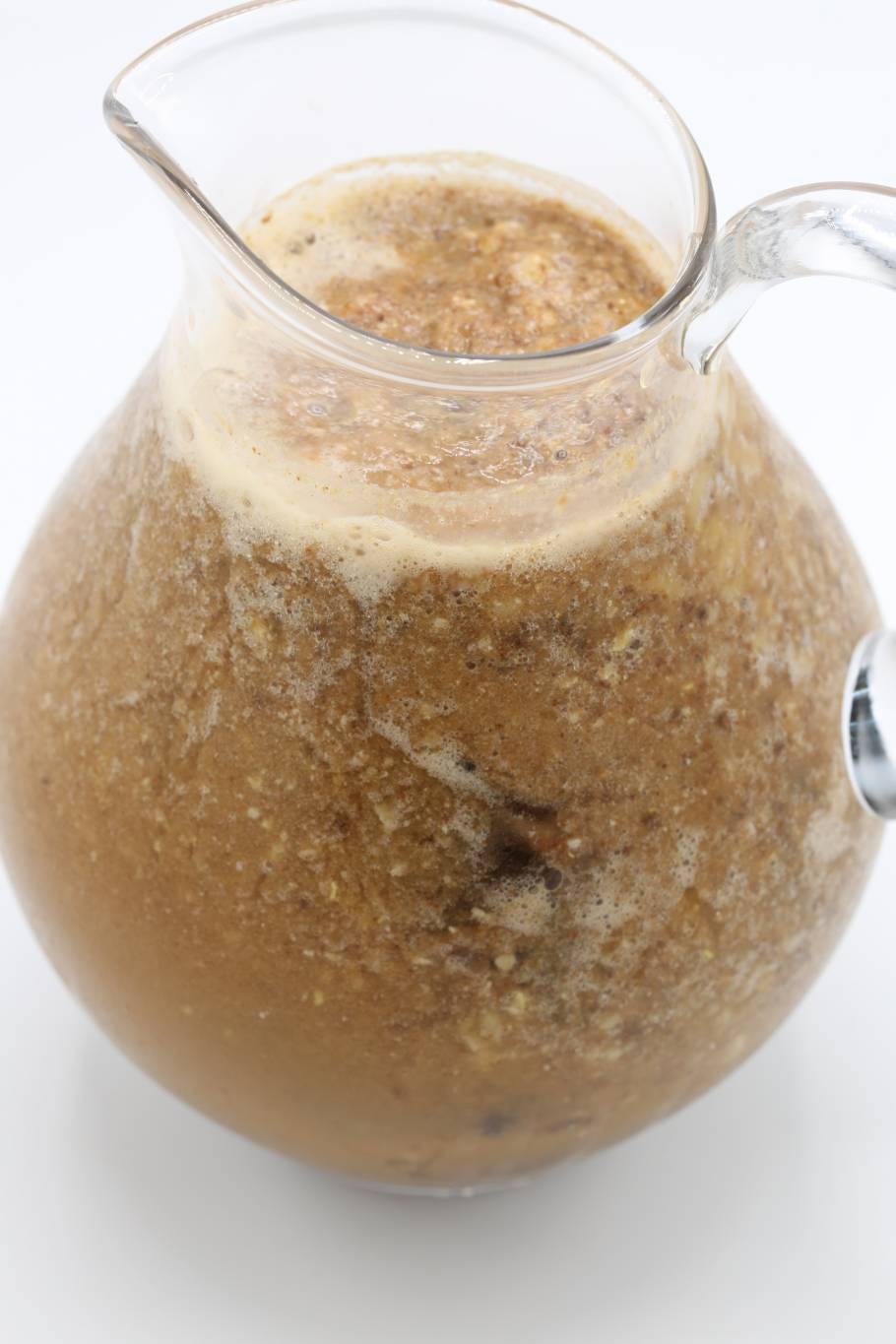 في إبريق الخلاط ضعي الزبيب، الصنوبر، ماء الزهر وعدة مكعبات من الثلج. أضيفي قليل من الماء وشغلي على سرعة متوسطة إلى أن يتكون لديك شراب ناعم ومتجانس. أضيفي الصنوبر وشغلي على سرعة متوسطة إلى أن يصبح الشراب ناعم القوام.