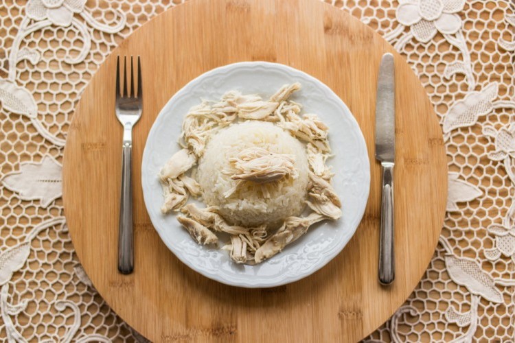 7. في طبق التقديم، ضعي الأرز في البداية، ومن ثم ضعي قطع الدجاج المسلوق وبعدها الصلصة الشركسية، ويمكنك تزيينها بحسب الرغبة.