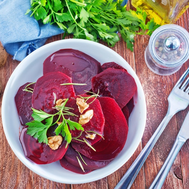 4. ضعي الشمندر في وعاء التقديم وصبي تتبيلة الزيت فوقه وقدميها.