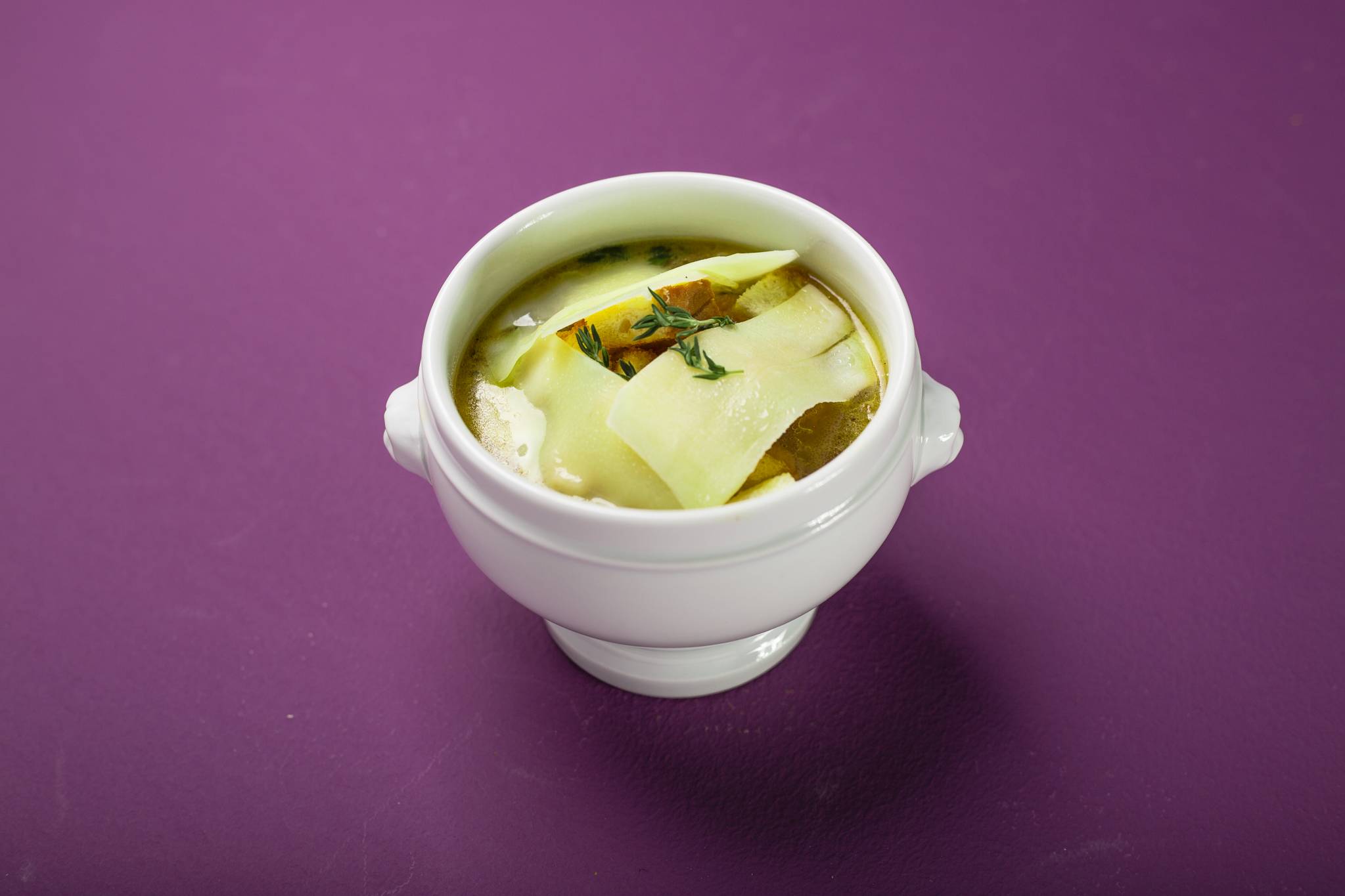 تصب الشوربة في 4 زبادي من الفخار وتغطى كل زبدية بـ 2 شريحة من الجبنة والقليل من قطع الخبز المحمص، ثم يضاف على الوجه جبنة الجروريير المبشورة. تنقل الزبادي إلى صينية للشوي وتوضع تحت شواية الفرن حتى تحمر الجبنة ويغلي وجهها.