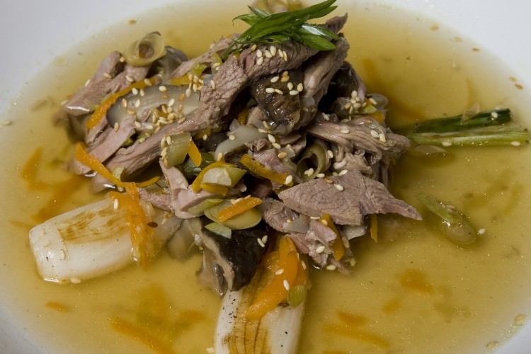 6. تسكب الشوربة في طبق التقديم، ثم يشوى البصل الأخضر ويوضع على الشوربة ويزين الطبق بورق الليمون وزيت السمسم والسمسم المحمر.
