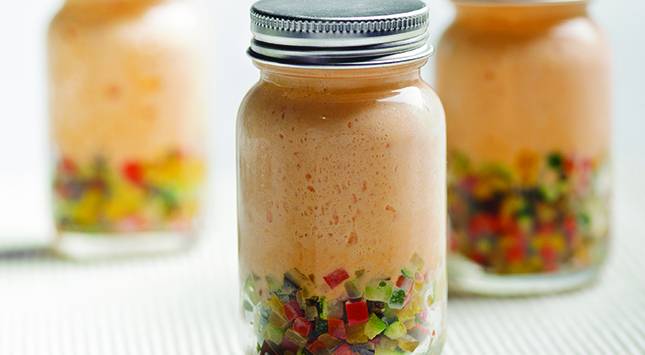 تُخلط الطماطم مع الخيار والفلفل والبصل في الخلاط الكهربائي حتى يتكون خليط ناعم، ثم يصفى الخليط عبر منخل ناعم جدًّا للحصول على خليط ناعم جدًّا.