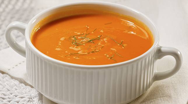 في قدر سعتها 2 لتر يطهى الجزر والبصل في الزبد الساخن إلى أن يطرى البصل.