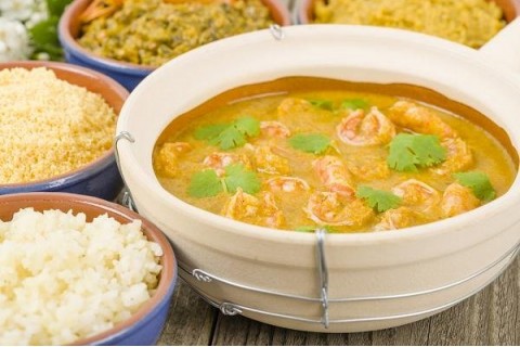 3. تضاف الطماطم، والجمبري، والكزبرة إلى البصل وتُهدأ النار حتى ينضج الجمبري مع تقليبه من وقت لأخر