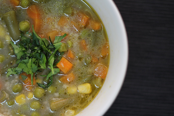 3. نضيف المرقة ونتبل بالملح والفلفل ونغطي القدر ويترك على النار لمدة 20 دقيقة حتى تستوي الخضار (ممكن زيادة كمية الماء أو المرق عند الحاجة)