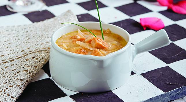 تغرف الشوربة في أوعية شوربة وتزين بأوراق الثوم المعمر المقطعة وتقدم.