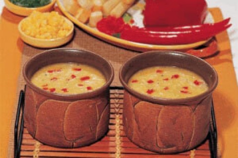 - تُمزج الفليفلة مع الذرة وشوربة الدجاج مع أحرف المعكرونة ماجي والماء في قدر كبيرة.