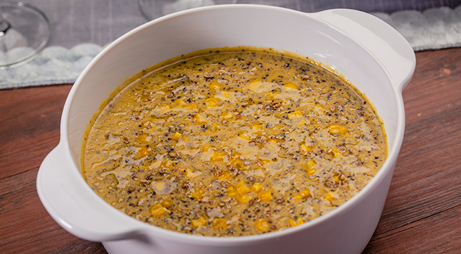 تضاف الكينوا + النشا و+ الفلفل الاسود تقلب وتترك لتطبخ حتي تنضج الكينوا 25 دقيقه مع التقليب من وقت لاخر