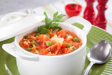- أسكبي الشوربة وأضيفي الطماطم والبقدونس. قدمي مع مكعبات الخبز المحمص وصلصة الفلفل.