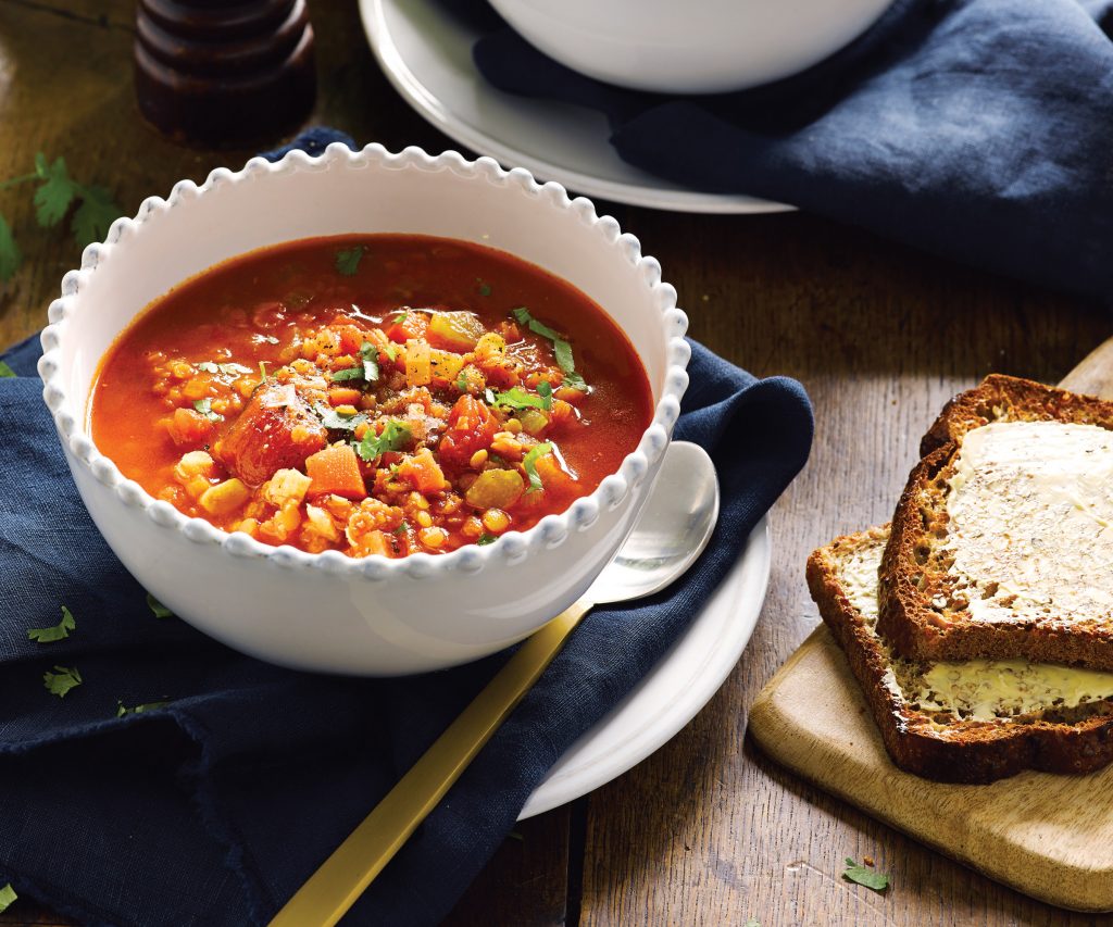 - قدم الحساء ساخناً، مع الخبز المحمص والسبريد.