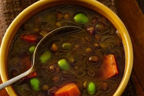 - أضيفي العدس، المرق، عصير التفاح، البطاطا والبازيلاء واتركيه على النار حتى تنضج المقادير ثم تبّلي بالملح والفلفل.