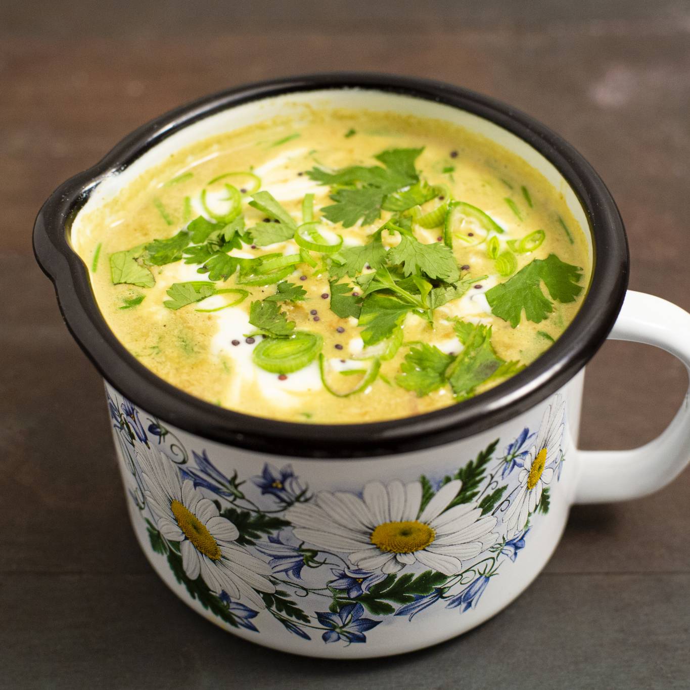يتم طهي البصل والثوم والزنجبيل ببطيء مع التقليب لمدة 5 دقائق يضاف الكركم والجرام ماسالا ويترك لينضج لمدة 30 ثانية إضافية، صب الماء (800مل) عليه/، ثم يُضاف جذور الكرفس المقطع والجزر والبقدونس ويترك المزيج حتى النضج مع غلق الغطاء والتقليب على درجة حرارة عالية لمدة 5 دقائق