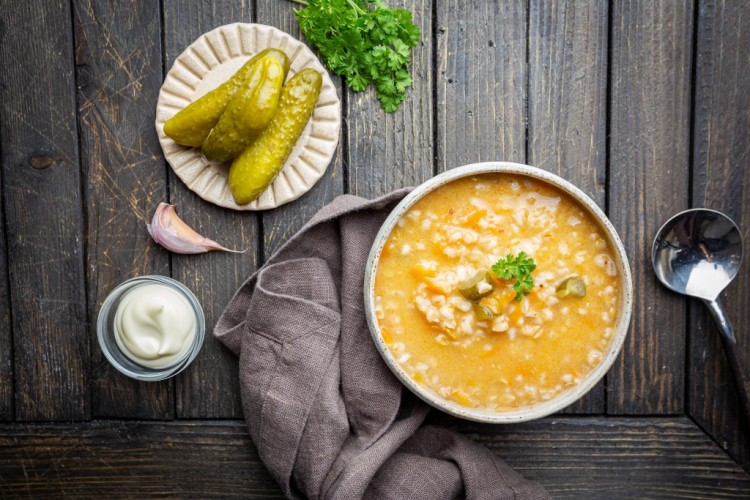 - زيني الطبق بكمية البصل المتبقية والمخلل المقطع وقدميه ساخناً.