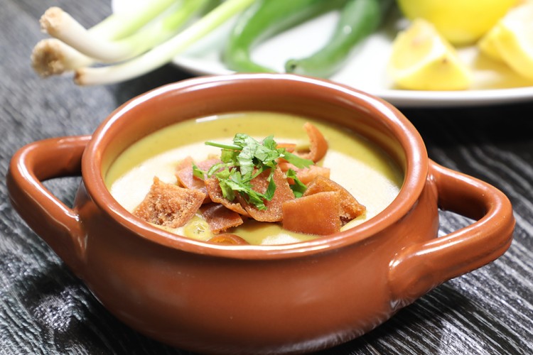 4. اهرسي الشوربة باستخدام آلة هرس الشوربة، واسكبيها بأطباق التقديم وقدميها ساخنة مزينة بالخبز المحمص.