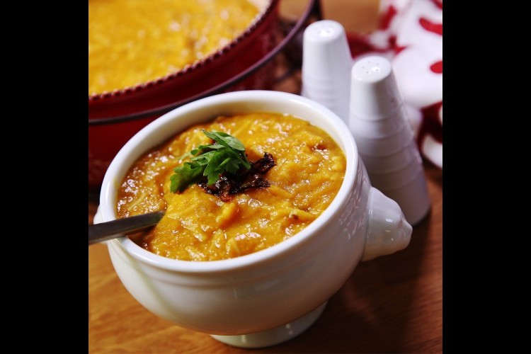 8. ضعي الشوربة في أطباق التقديم ثم وزعي بقية البصل فوقها وقدميها.