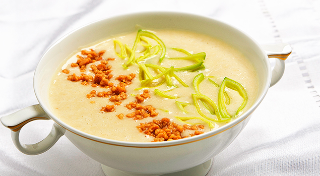توضع البطاطس والكراث والبصل والمرق في قدر كبيرة الحجم ويُغلوا. تُخفض درجة الحرارة إلى منخفضة، ويُغلي الخليط برفق لمدة 20 دقيقة أو حتى تطرى البطاطس.