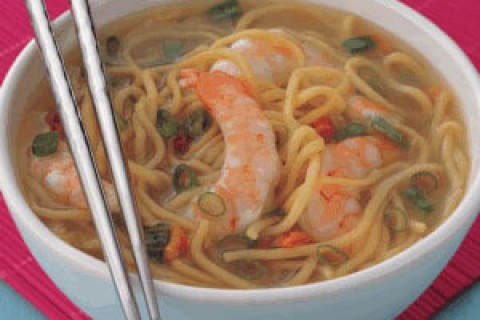 - يُضاف القريدس و النودلز وتُغلى المكونات وتُترك على نارٍ خفيفةٍ لمدّة 5 دقائق إضافيّة أو إلى أن ينضج القريدس و النودلز جيّداً.