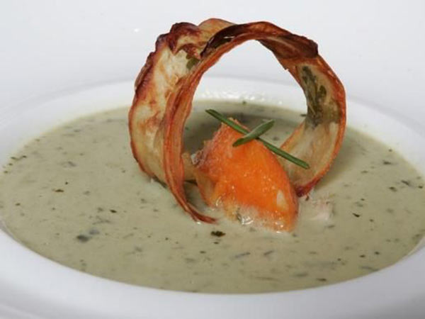 5. يفرم الحساء في الخلاط ، ثم يضاف الدجاج اليه من جديد، وكذلك الملح والبهار. يقدّم هذا الطبق ساخناً.