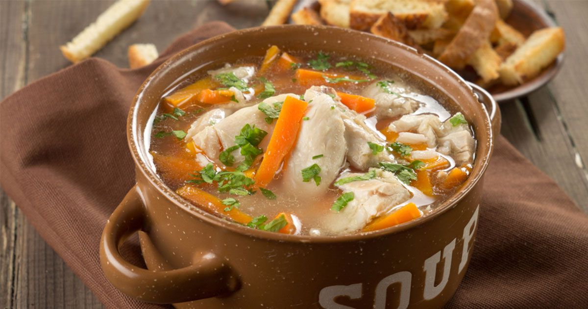 5- أسكبي ماء سلق الدجاج في قدر على نار متوسطة ثم زيدي قطع الدجاج، الجزر والشعيرية ونكهي بالملح.