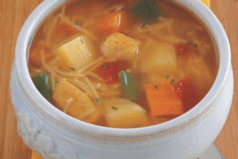 - يُسخّن زيت الزيتون في قدر متوسطة الحجم غير لاصقة. يُضاف الدجاج ويُطهى حتى يتغيّر لونه. تُضاف الطماطم، الجزر والبطاطا وتُقلّى لمدة 5 دقائق.