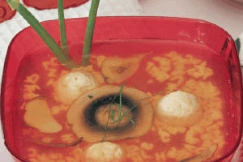 2. توضع كرات الدجاج مع الفطر وشوربة الدجاج مع أحرف المعكرونة ماجي والماء في قدر كبيرة.
