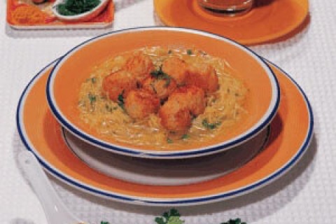 - يُمزج الدجاج المفروم مع الثوم والزنجبيل والكاري في وعاء ثم يُقرّص المزيج إلى كرات صغيرة.