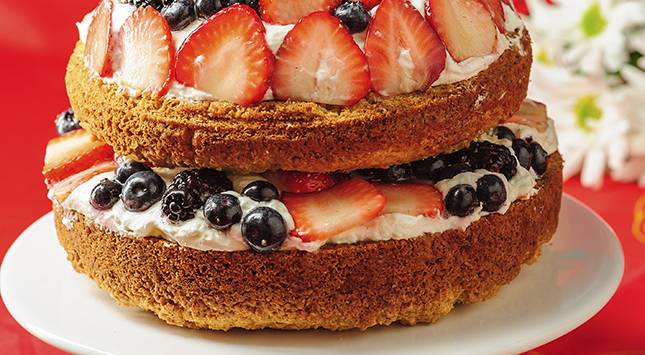 توضع نصف كمية العنبيات والكريمة المخفوقة على الكعكة الكبيرة ويوضع فوقها الكعكة الأصغر. تُغطى بالكريمة المخفوقة والكمية المتبقية من العنبيات.